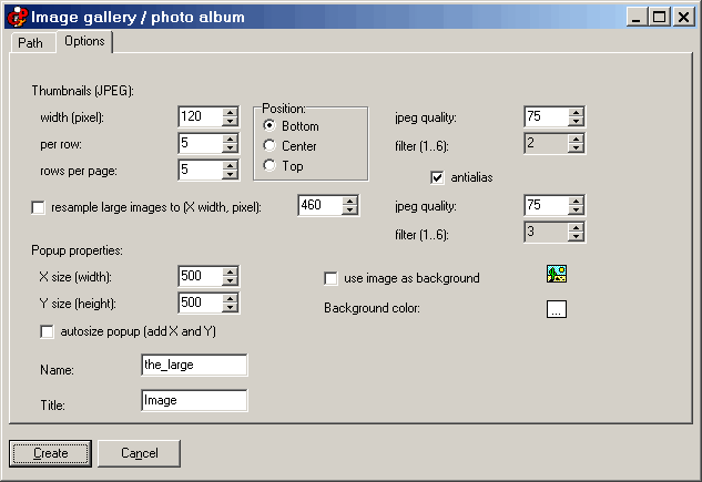 Here you can set the options for the thumbnails. You may as well force the program to resample the large image (this may be useful - say your images are 2400 x 1600 and you need images with a more reasonable size such as 640 x 400).