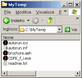 f) Apri il tuo programma di masterizzazione (EasyCD, Nero, o WinOnCD) e masterizza il CD con questi file della cartella temporanea e gli eventuali altri file (tipo "mydocument.pdf" nella cartella "data"). Nel caso più semplice, la root (cartella principale) del CD conterrà questi file: